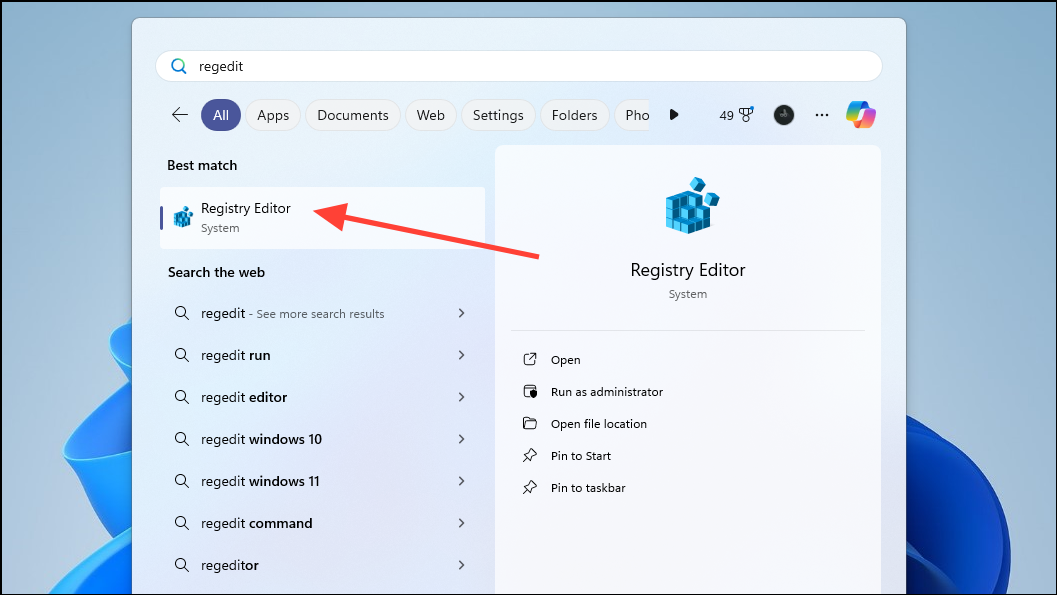 Regeditto bring up the Registry Editor. - Click on the Registry Editor to open it once it appears.
