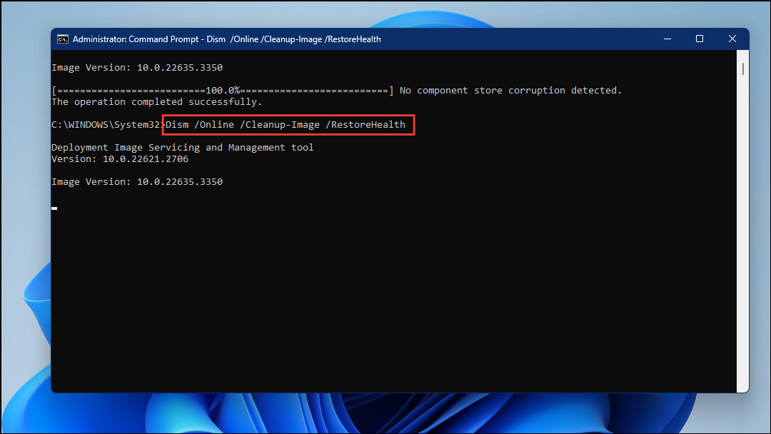 Dism /Online /Cleanup-Image /RestoreHealthand press the 'Enter' key to complete the process.