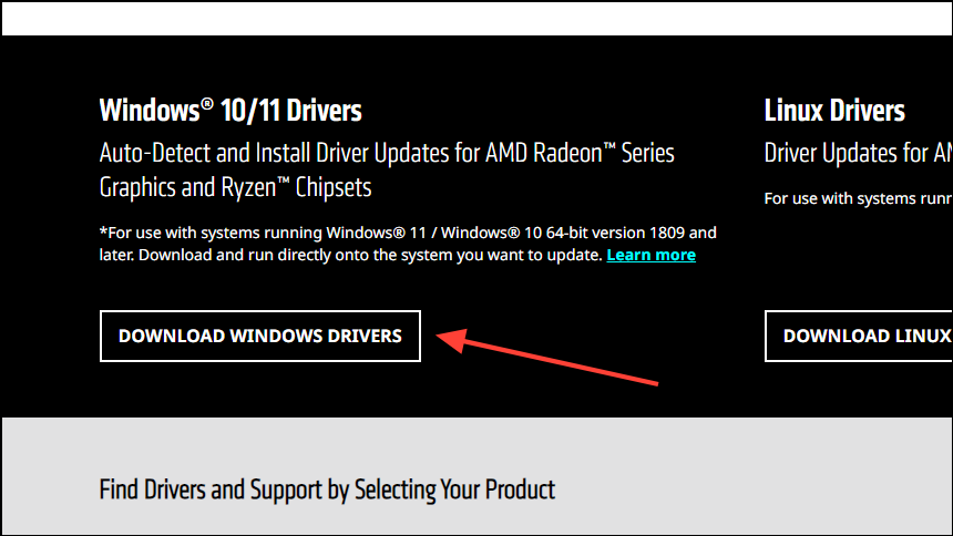 - Visit the AMD support website and click on the 'Download Windows Drivers' button.