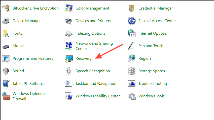 - Open the Control Panel on your PC and click on the 'Recovery' option.