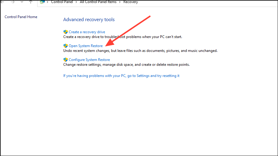 - This will take you to the System Restore page. Click on the 'Open System Restore' option.
