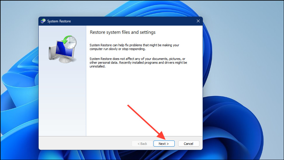 - When the System Restore box opens, click on the 'Next' button to proceed.