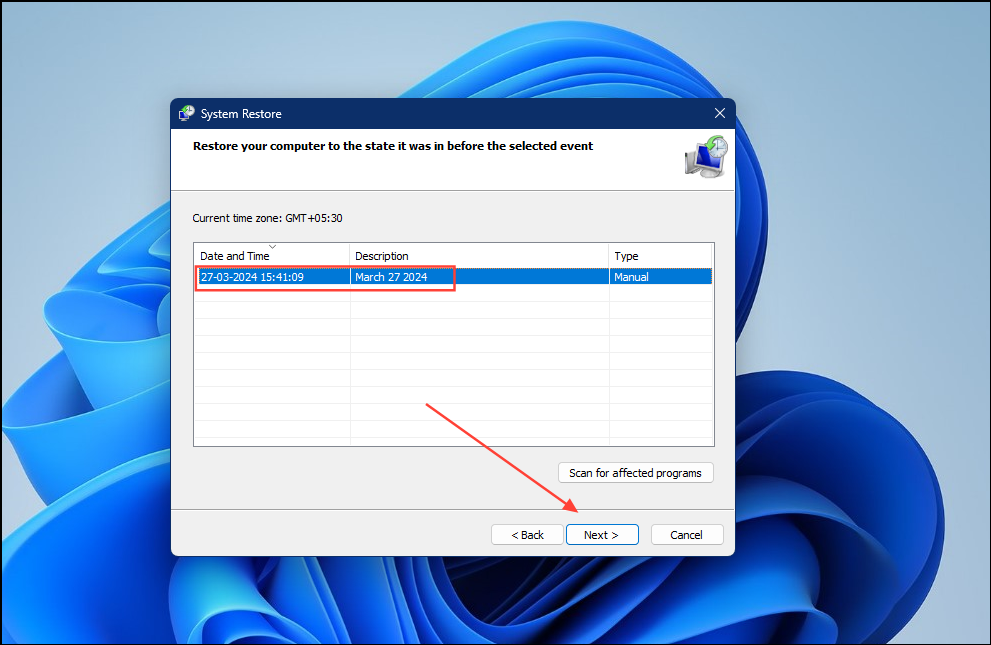 - On the next page, you can select the restore point you created earlier. If there are multiple restore points, you will find all of them here. Click on the 'Next' button after selecting the desired restore point.