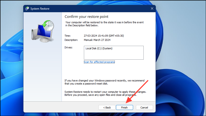 - Finally, click on the 'Finish' button to complete the process. When you restart your computer next time, it will be restored to the earlier point before the error occurred.