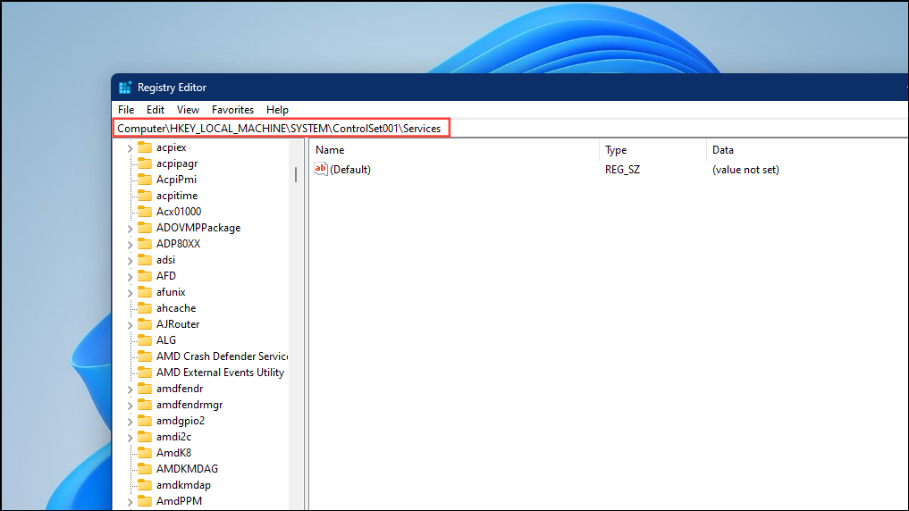 Computer\HKEY_LOCAL_MACHINE\SYSTEM\ControlSet001`\Services\. Alternatively, just copy and paste it into the address bar and press the 'Enter' key.