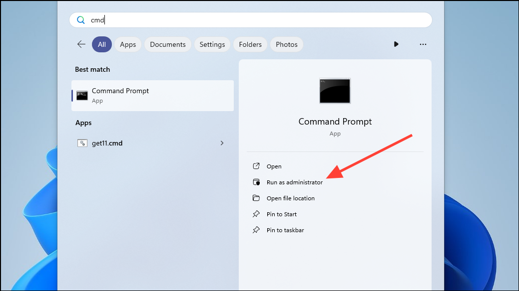 command promptorcmdto search for command prompt. - When it appears, click on the 'Run As Administrator' option on the right side and click on the 'Yes' button in the User Account panel to launch command prompt.