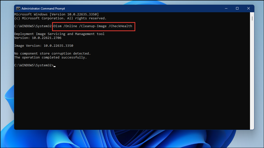 Dism /Online /Cleanup-Image /CheckHealthand press the 'Enter' key to run the system health check. It will look for and fix any corruption issues that may be causing the problem.