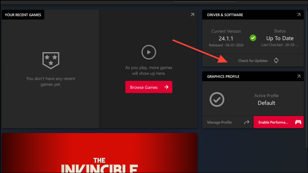 - On the right side, you will find the 'Drivers and Software' section. It will show you the graphics driver version. Click on the 'Check For Updates' button here.