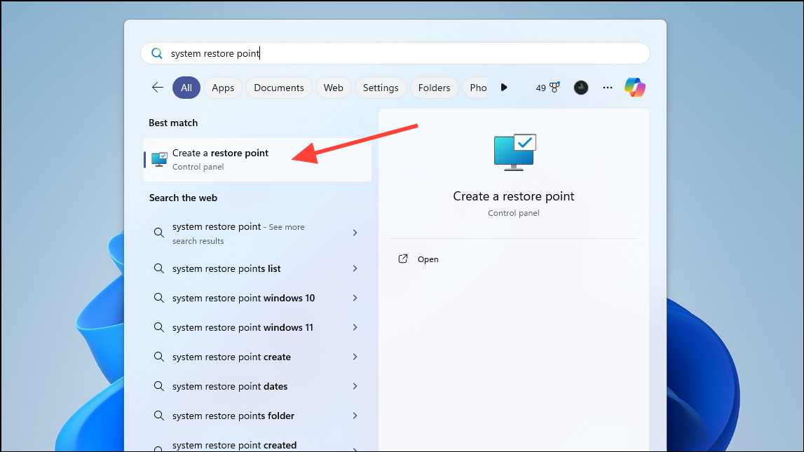 system restore point. - Click on the first item 'Create A Restore Point' that appears in the search results.