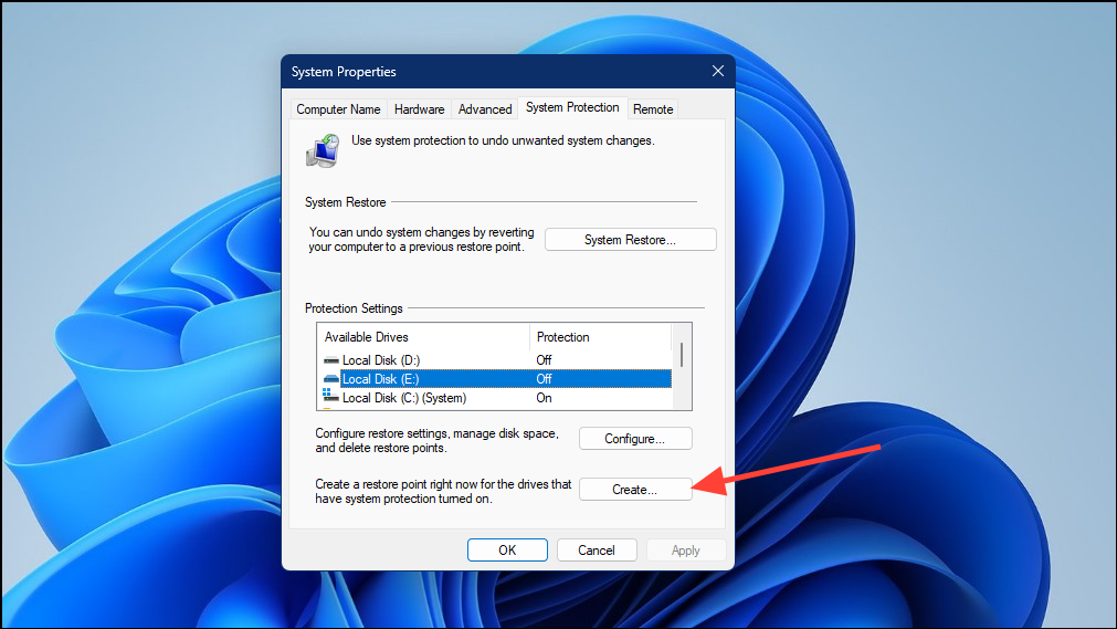 - A pop-up box will appear where you can select the drive where the restore point will be created. Click on the drive you prefer and then on the 'Create' button.