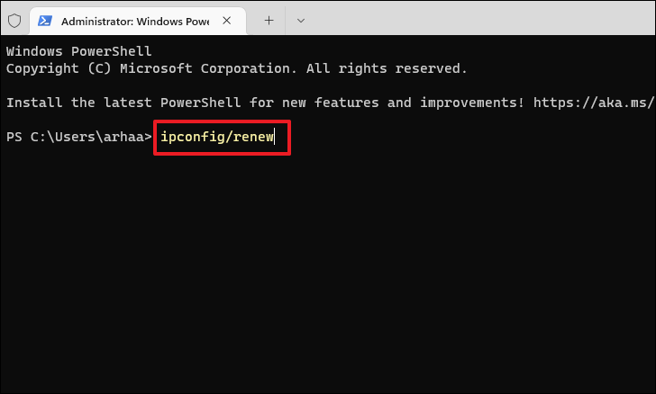 Step 4: Next, type the following command and press Enter to request a new IP address: