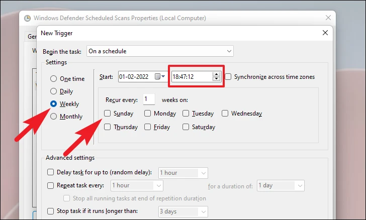Step 6: In the New Trigger window, set the task to begin On a schedule. Choose the Weekly option, select a day and time when your computer is typically idle, and click OK to save the new trigger.