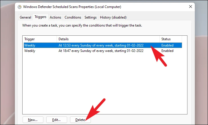 Step 7: Back in the Triggers tab, select any existing triggers that you did not create and click Delete to remove them. This ensures that scans only occur at the scheduled times you've set.