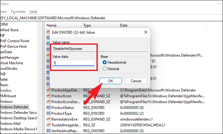 Step 5: Double-click on DisableAntiSpyware, set the Value data to 1, and click OK.