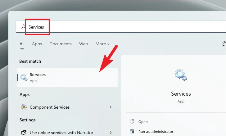 Step 1: Open the Start Menu, type Services, and select the Services app from the search results.