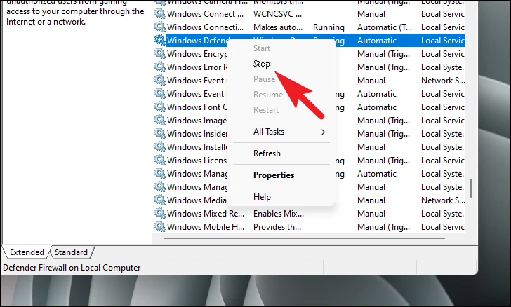 Step 2: In the Services window, scroll down to find Windows Defender Antivirus Service. Right-click on it and choose Stop from the context menu.