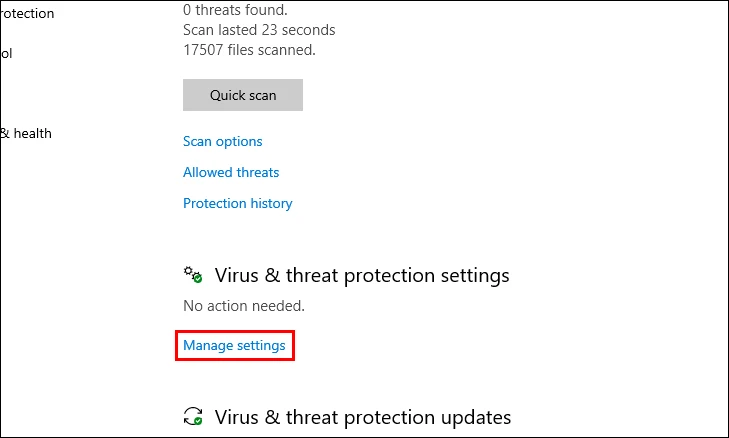 Step 3: Under the Virus & threat protection settings, click on Manage settings.