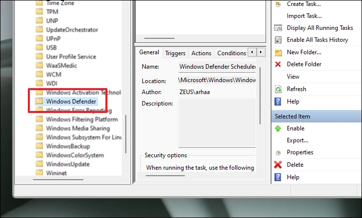 Step 3: Scroll through the list and locate the Windows Defender folder. Click on it to view its tasks in the center pane.