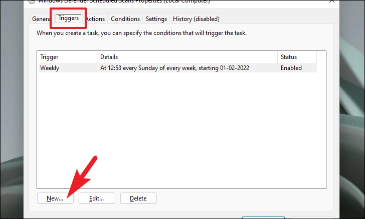 Step 5: In the Properties window, switch to the Triggers tab and click on New to create a new trigger.