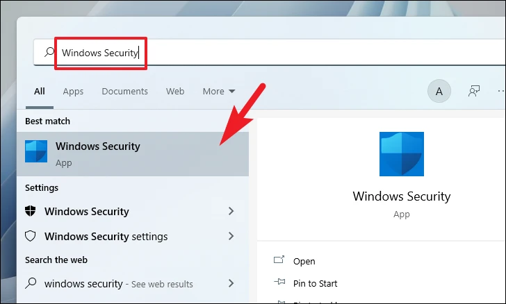 Step 1: Open the Start Menu, type Windows Security, and select the Windows Security app from the search results.