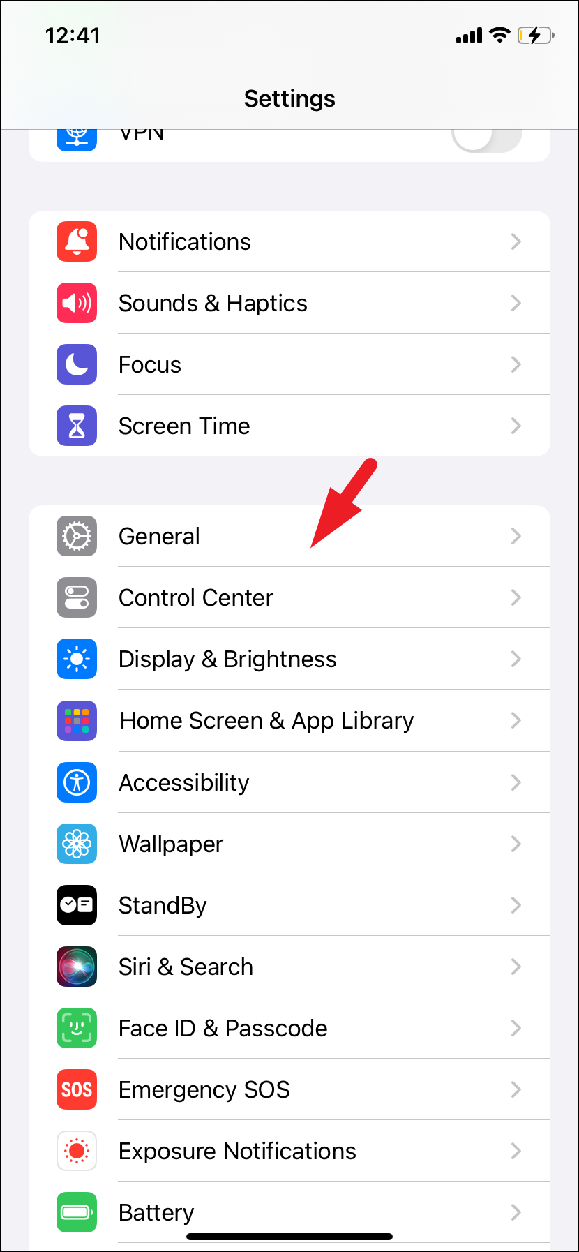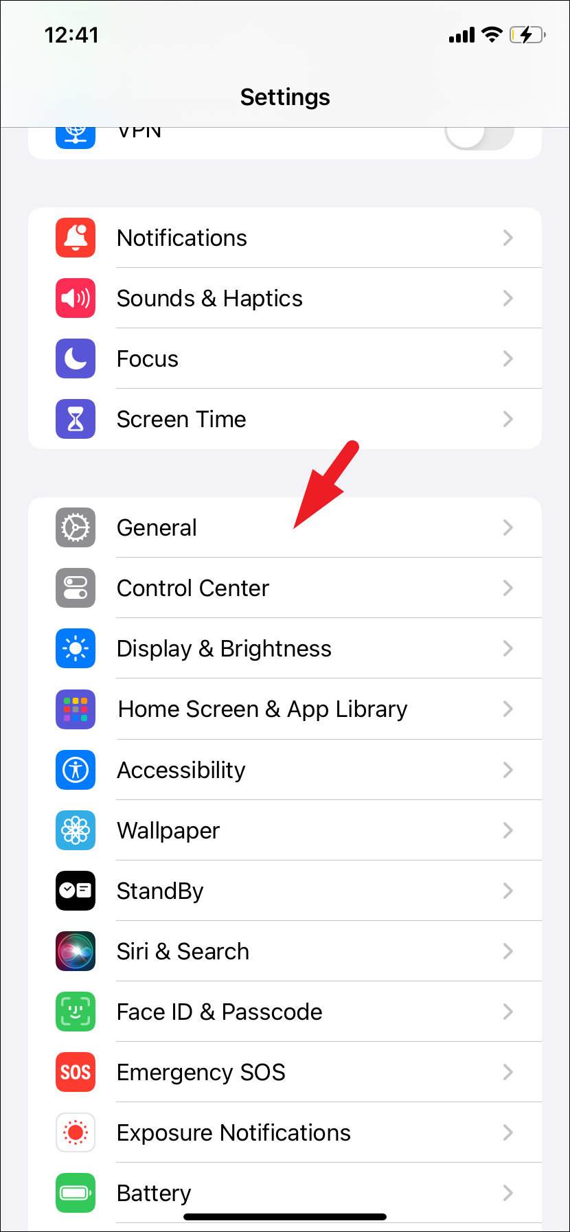 - Tap on the ‘General’ option from the list to proceed.