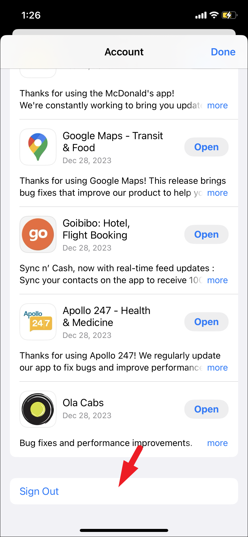 - Scroll to the bottom of the screen and tap on the ‘Sign Out’ button.