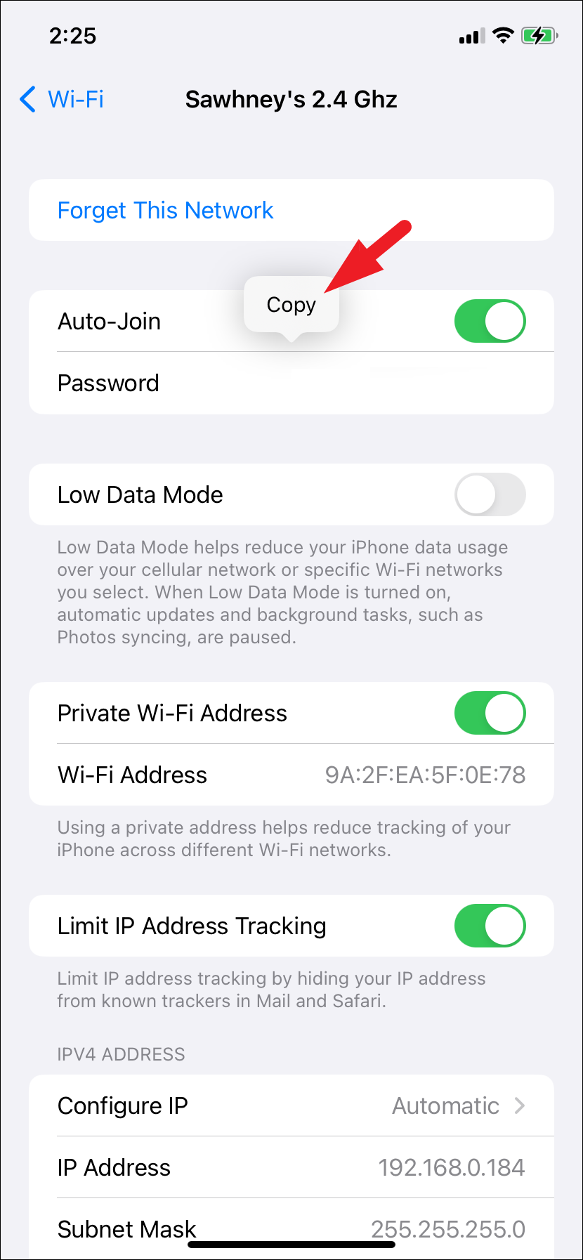 - Tap on the 'Password' field to reveal it. Then, select 'Copy'. You will need this password to connect with this network again. If there's no 'Password' field, the network does not require a password to connect.