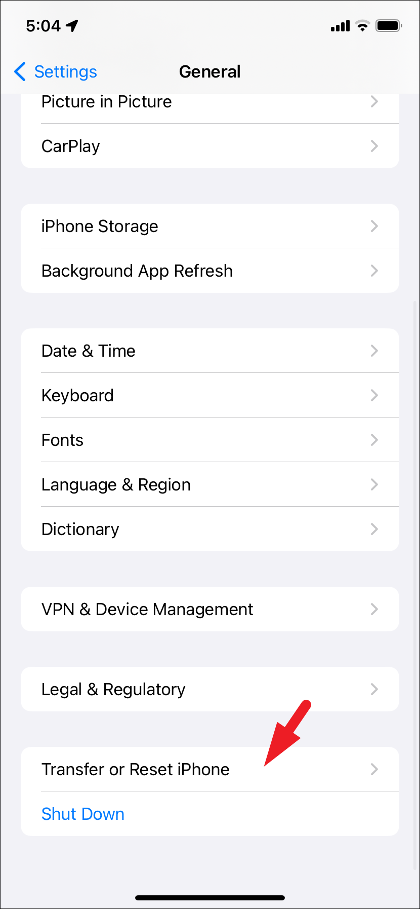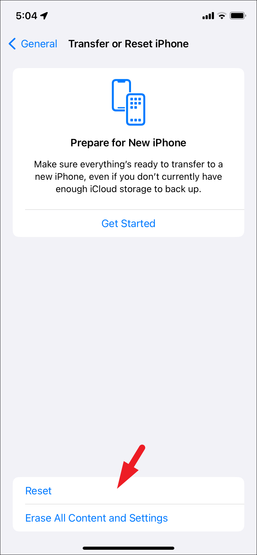 - Tap on the 'Transfer or Reset iPhone' to continue.