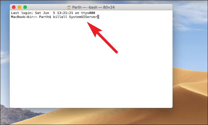 Next, enter the command killall SystemUIServer and press Enter to kill the SystemUI Server process.