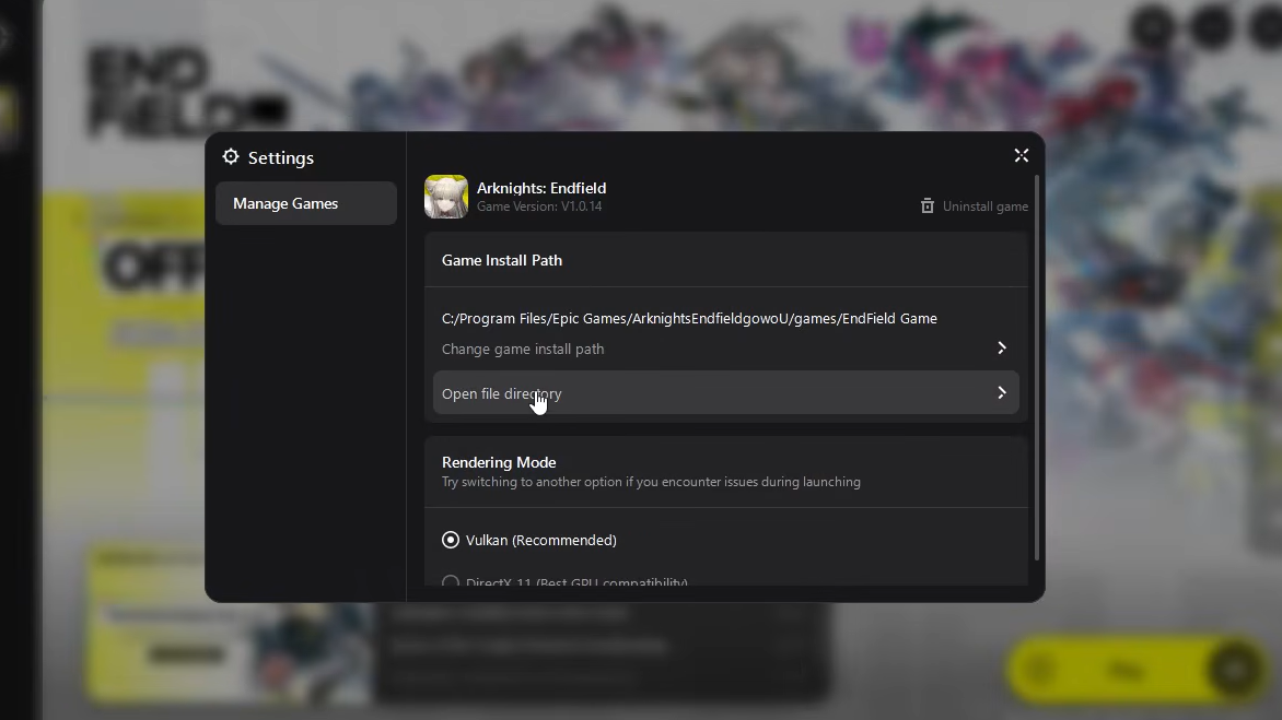 Step 2: In the Epic Games Launcher, find Arknights: Endfield in your library. Click the three-dot menu next to it, select Manage, then click Verify next to "Verify Files." Wait for the process to complete.