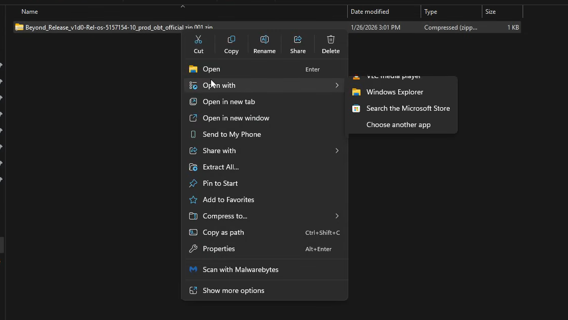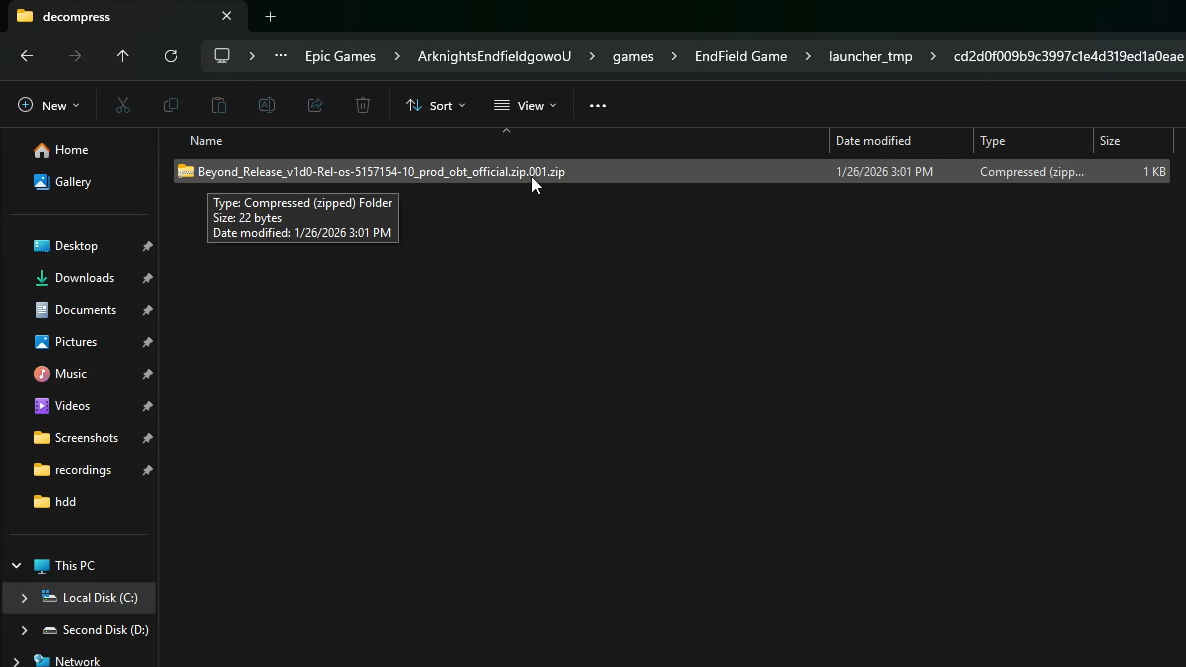 Step 3: Inside the decompress folder, locate the file named something like Beyond_Release_v1d0-Rel-os-5157154-10_prod_obt_official.zip.001. Right-click it and open it with WinRAR, 7-Zip, or any archive tool that handles split zip files. The archive is very large, so extraction will take a while.
