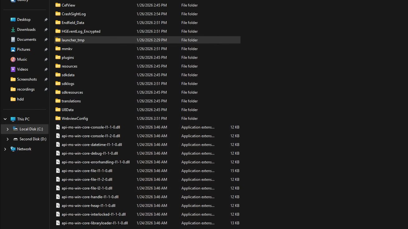 Step 2: Navigate to your game installation folder. The default path is typically C:\GRYPHLINK\games\EndField Game. Inside that folder, open the launcher_tmp directory, then look for a subfolder called decompress. You may need to navigate through an intermediate folder with a long alphanumeric name to reach it.