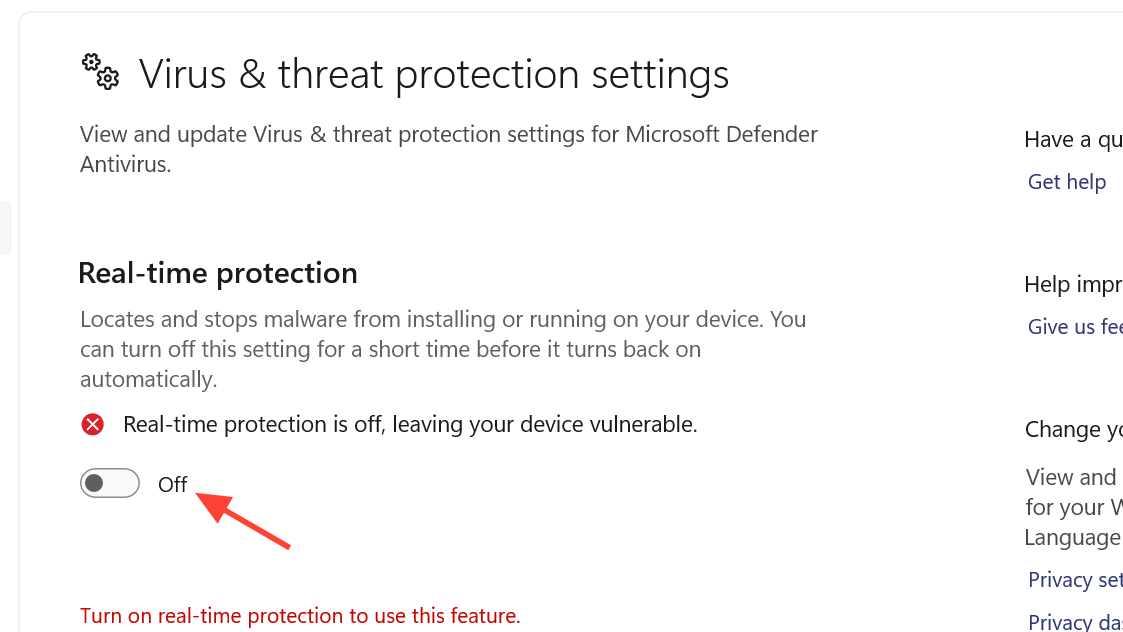 Step 1: Open Windows Security, go to Virus & threat protection, then Manage settings, and toggle off Real-time protection. Keep it off for the entire download and installation process.
