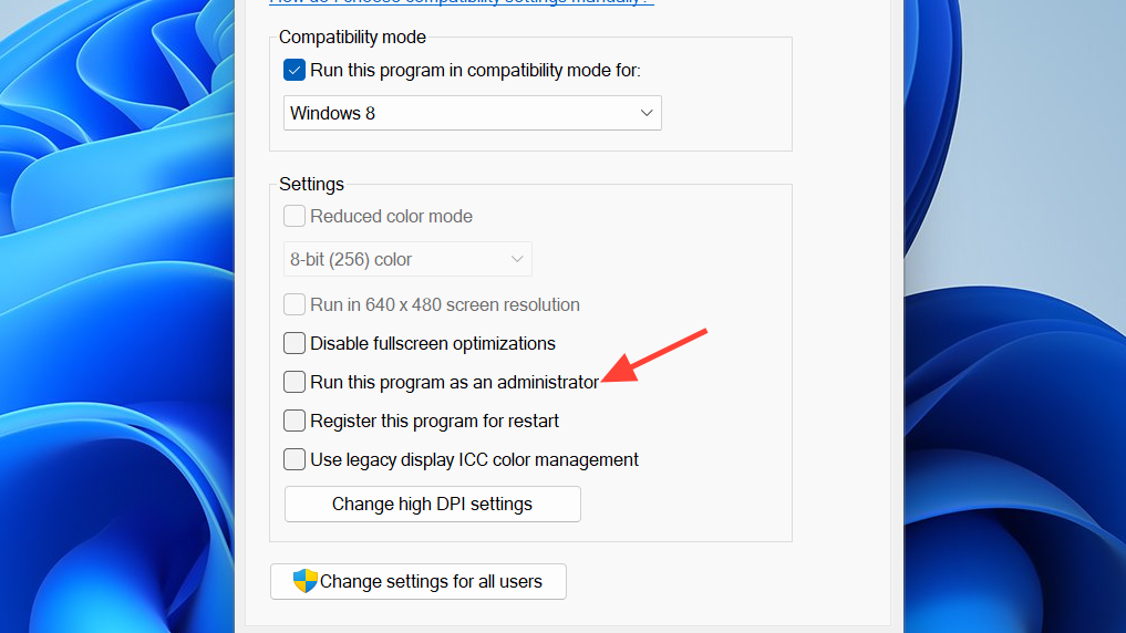 Step 3: Check the box labeled Run this program as an administrator. Click Apply, then OK.