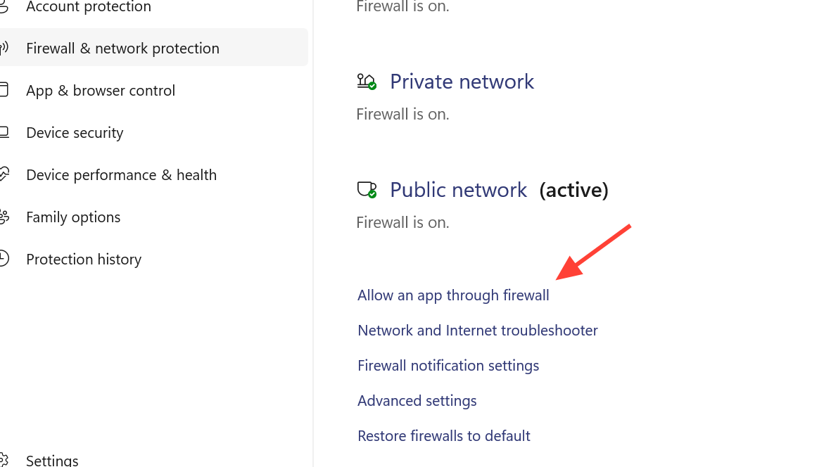Step 1: Open Windows Defender, go to Firewall & network protection, and select Allow an app through firewall.