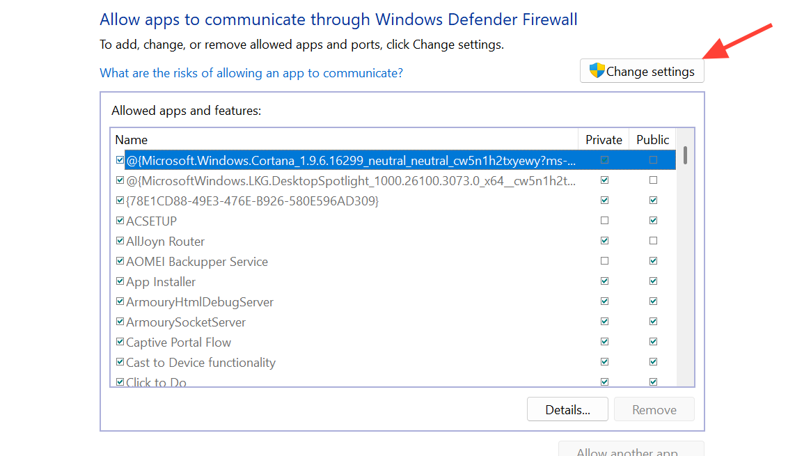 Step 2: Click Change settings, then Allow another app. Browse to the Endfield install folder and select Endfield.exe.