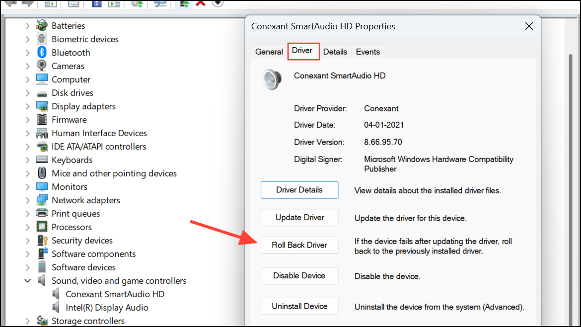 Step 2: Go to the "Driver" tab and click "Roll back driver", if the option is available.