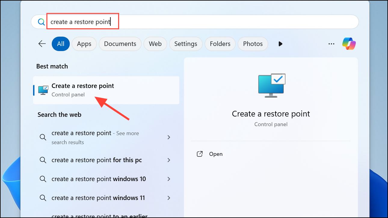 Step 1: Type "Create a restore point" in the Windows search bar and open the System Properties window.