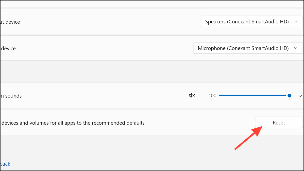 Step 4: If the output for Edge is blank or incorrect, select the right device. At the bottom of this page, click Reset sound devices and volumes for all apps to the recommended defaults to restore all app audio settings. This action often resolves missing audio for specific browsers or sites.