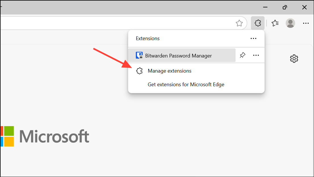Step 1: In Edge, click the Extensions icon near the address bar. If not visible, click the three-dot menu (...) and select Manage Extensions.