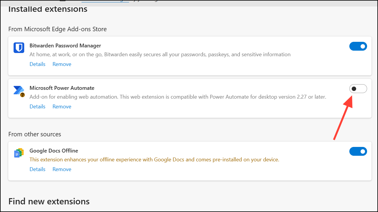 Step 2: Turn off all extensions using the toggle switches. Some extensions can block or interfere with audio playback on specific sites.