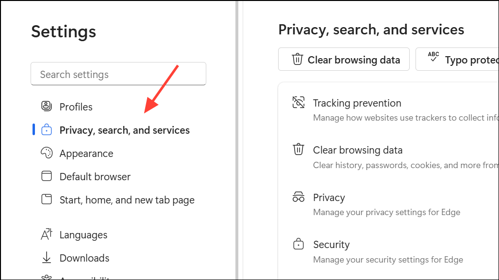 Step 1: Click the three-dot menu (...) in the upper-right corner of Edge, then go to Settings > Privacy, search, and services.