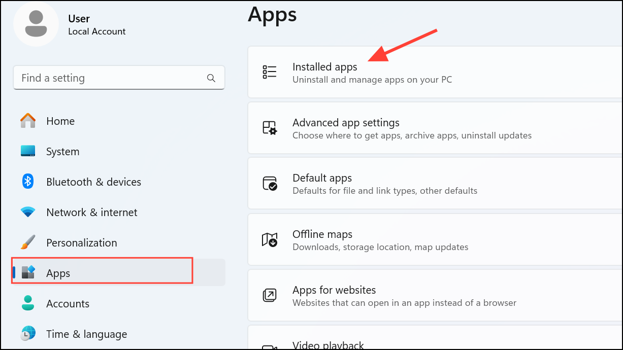 Step 1: Begin by fully uninstalling AutoCAD. Go to Windows Settings, select "Apps," then "Installed apps."