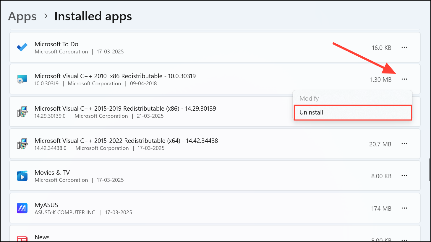 Step 3: After AutoCAD has been uninstalled, you should also uninstall all Microsoft Visual C++ Redistributables. Navigate to "Apps" again, type "Visual C++" into the search bar, and uninstall each listed redistributable package. Restart your system once all redistributables are removed.