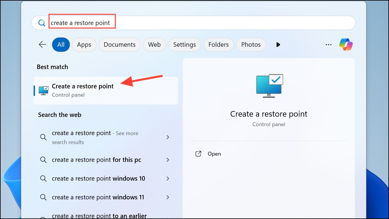 Step 1: Open the Start menu, type "Create a restore point," and select the matching result. In the System Properties window, click "System Restore."