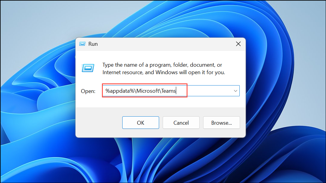 Step 2: Hold the Windows key and press R to open the Run dialog. Enter %appdata%\Microsoft\Teams and click OK.
