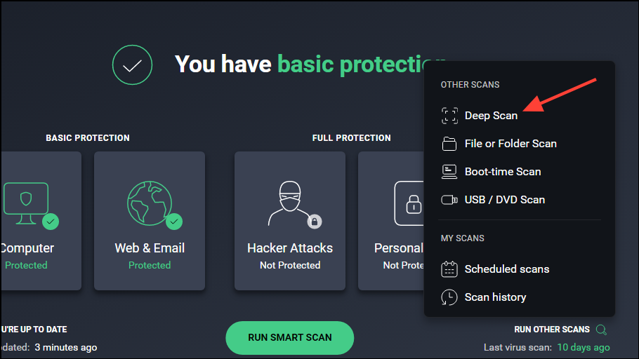 - When your antivirus opens, click on the 'Complete scan' or 'Deep scan' option and let it scan your system. Wait until the scan is complete and then perform the steps your antivirus suggests to get rid of viruses and malware.