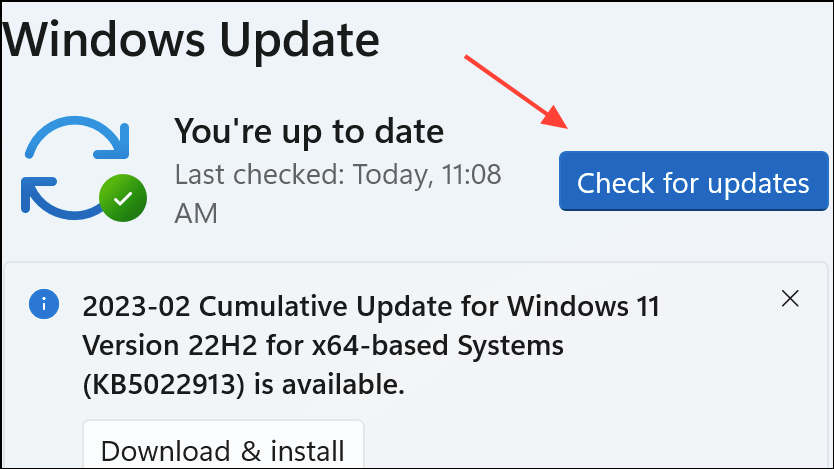 - Click on the 'Check for updates' button and Windows will check for and install all available updates. You can then reboot your PC.