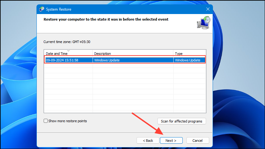 - You will see several restore points depending on how many you had created earlier. Select the restore point you want to restore and click on the 'Next' button.