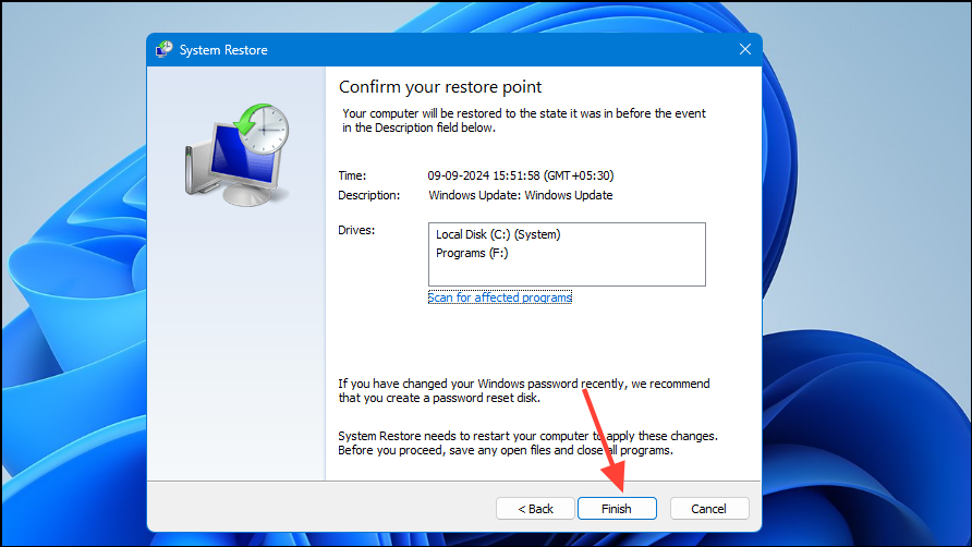 - Finally, click on the 'Finish' button and your computer will reboot and go back to the restore point you selected.